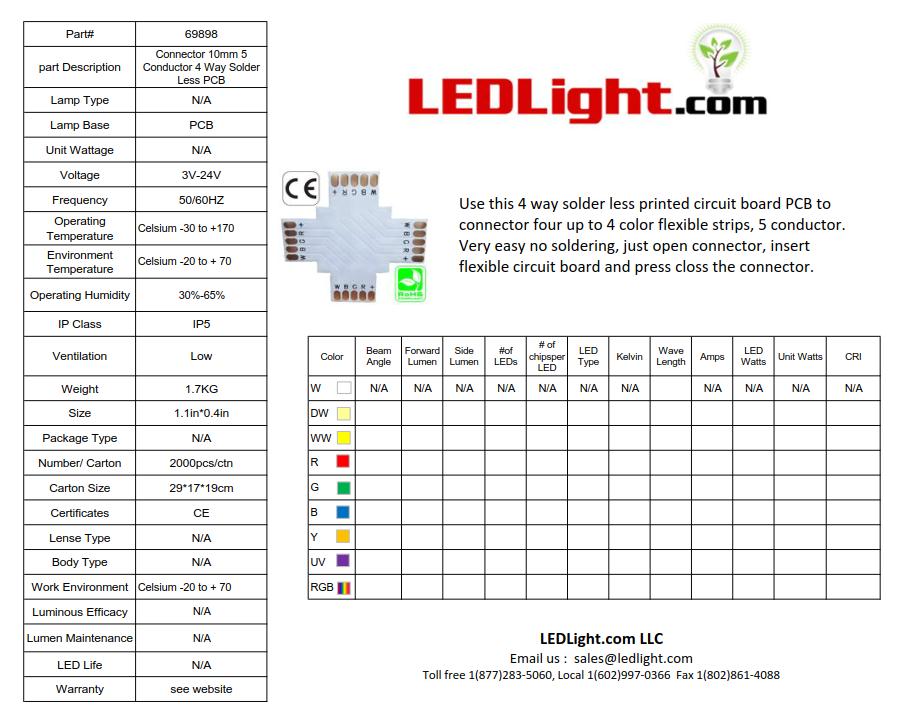 Connector, 10mm, RGB Color, No Wires. Use this quick connector to hook up and interlink RGB flexible 10mm LED strip. Made of PBT and metal materials. CE and Rohs listed.