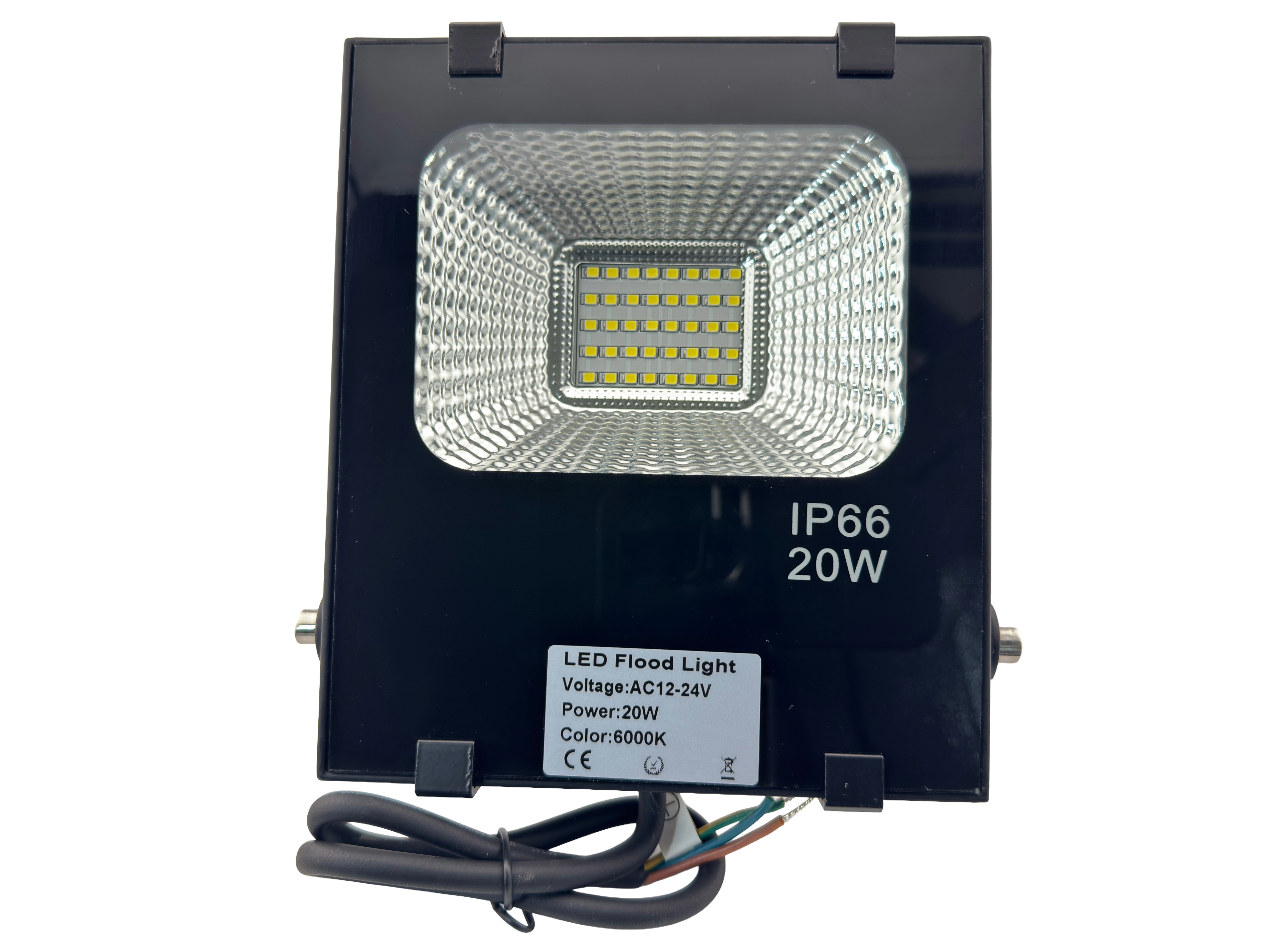 Rebaydo 20 Watt LED Flood Light 12-24V AC is designed for approx. 12-24V AC systems using direct input leads, producing up to approx. 1600 lumens with approx. 40 Sanan 2835 LED chips for long life and consistent performance. Features approx. 120 degree viewing angle, approx. 6000K white color temperature, and power consumption of approx. 20 watts comparable to approx. 180 watt incandescent bulbs, with a rated lifespan up to approx. 30000 hours and not dimmable. Built with an aluminum body and toughened glass for impact resistance, with approx. 0.5 meter rubber cable and operating temperature range approx. -30°C to approx. 60°C, power factor approx. 0.95 and CRI ≥ approx. 80. Dimensions are approx. 7 inches length × approx. 6.25 inches width × approx. 2 inches depth, with approx. 18 inches cable length, approx. 1.75 inches hole-to-hole mounting space, and approx. 0.37 inches wire hole between mounting holes. Rated for approx. 20 watts, approx. 12-24V AC, and draws approx. 1.41 amps at approx. 13.8 volts. CE, RoHS listed.
