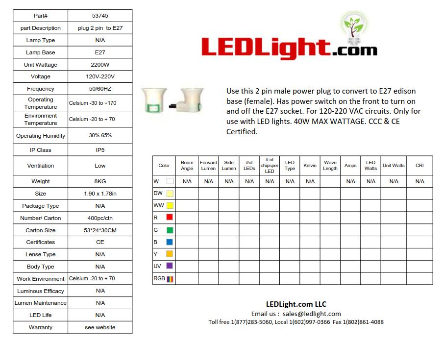 Use this 2 pin male power plug to convert to E26-E27 edison base (female).  Has power switch on the front to turn on and off the E27 socket. For 120-220 VAC circuits. Only for use with LED lights. 40W MAX WATTAGE. Works great as a night light. CCC & CE Certified.