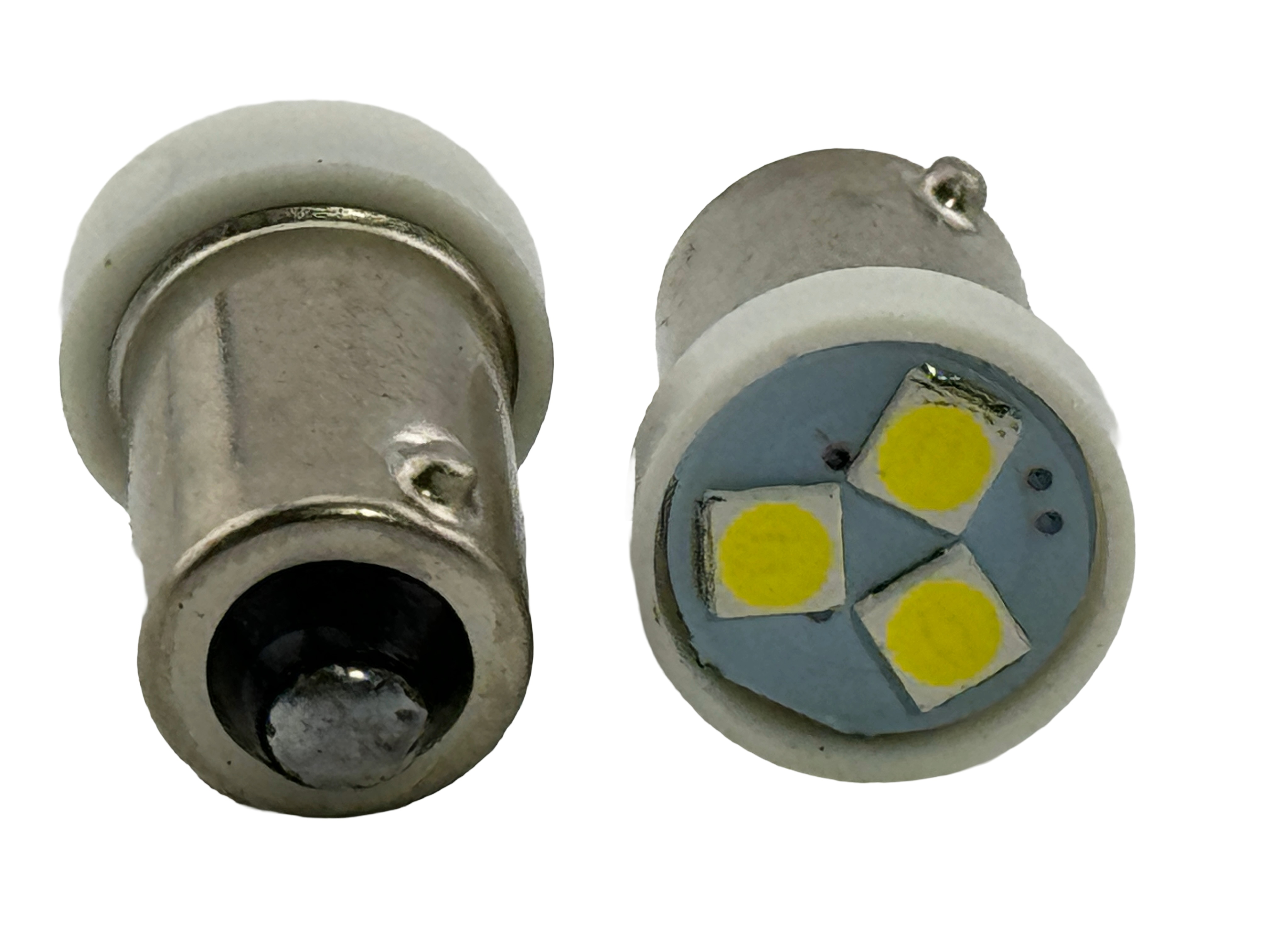 Rebaydo 2pcs 55 Miniature Bulb BA9S Base 6 Volt 3 SMD 3030 LED T3 1/4. Small outline to match the 55 Miniature bulb. .7 inches long by .46 inches wide at the plastic ring. The base diameter is .39". Up to 135 Lumen output forward firing or up to 10 CP candle power. The led's are small 3030 smd so they are very low profile. Each 3030 smd can output up to 130 Lumens. The BA9S base is designed to operate at 6 volt ac or dc for both positive ground and negative ground vehicles. The life is up to 30,000 hours. This led lamp is dimmable using a variable voltage supply such as a dashboard dimmer. The bulb is comparable to a 4 to 10 watt halogen light bulb. The viewing angle of the 3030 LED's is 120 degrees. Available in White 5500K to 6500K, Warm White 2700K-3300K, Red, Green, Blue and Yellow/Amber. CE and Rohs listed. This bulb uses 90% less energy great for old generators. Uses .079mA at 6.8 volts.