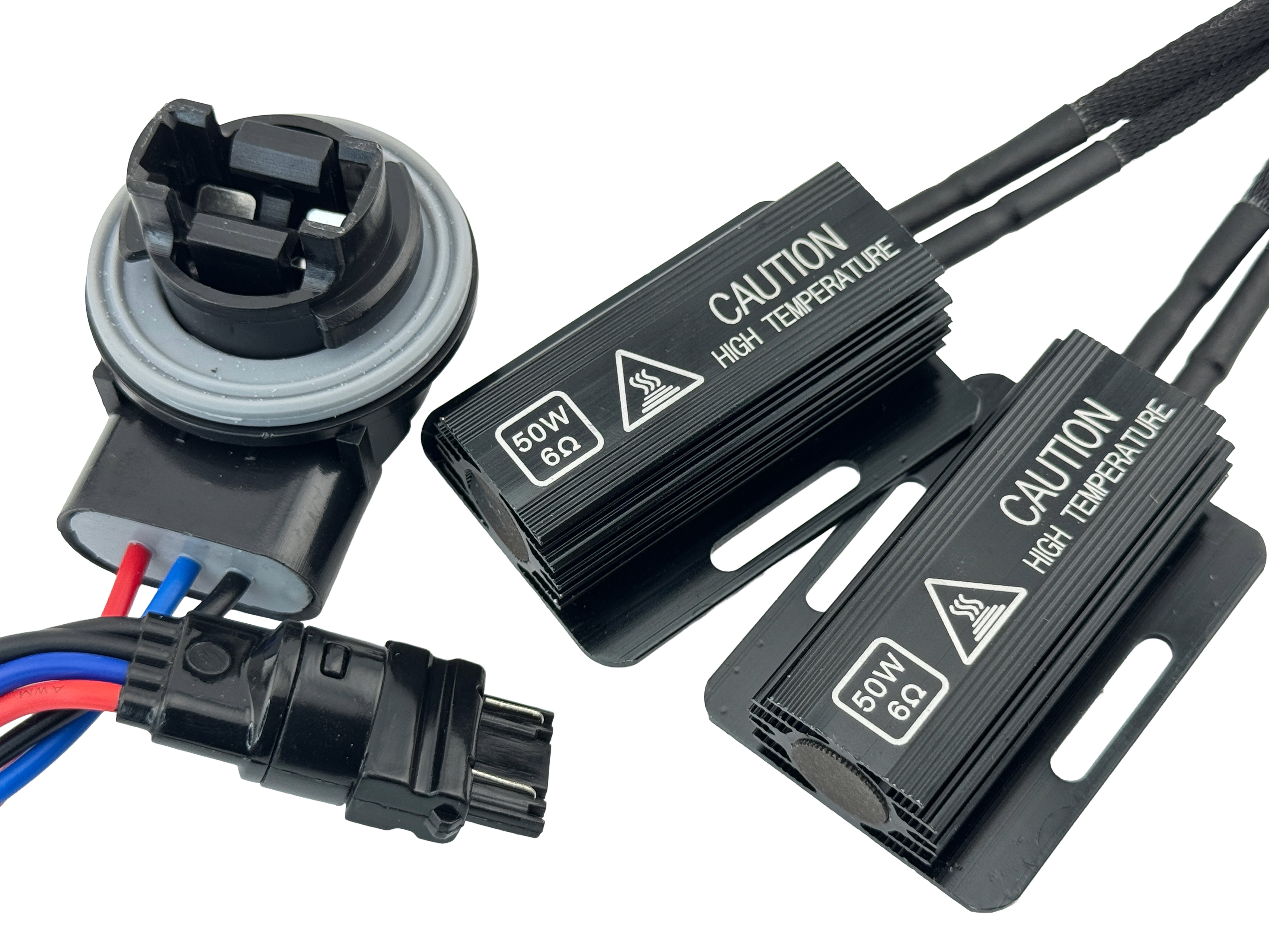 3157 load equalizer, Fits T25 socket, 6V or 12 VDC systems, eliminates the hyper flash, because the vehicle does not see the LED light. CE and Rohs listed. Gets very hot, must mount on metal surface . Come with male and female 3157 sockets, inline. |