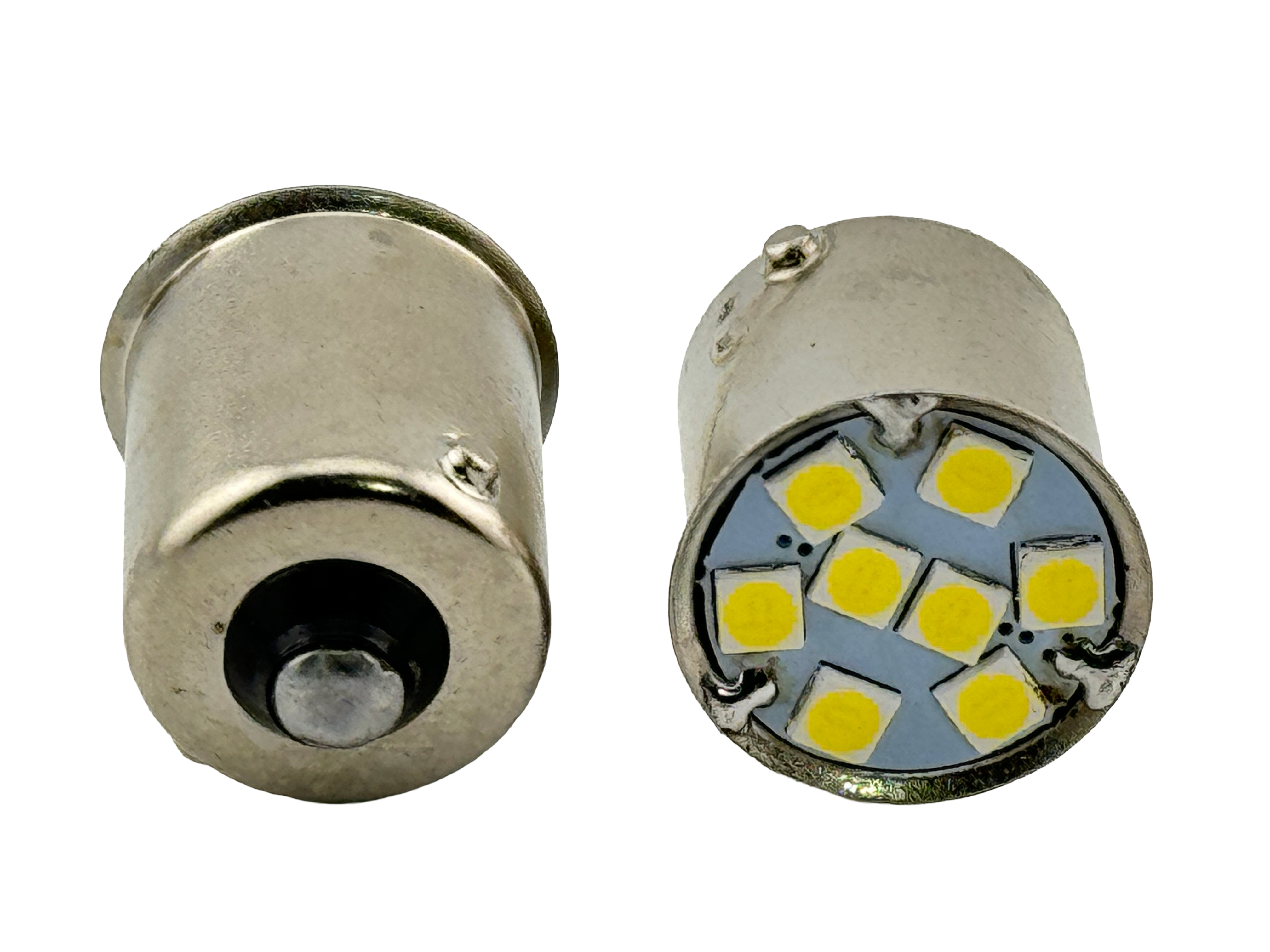 63 LED Bulb 8 to 9 Volt BA15S Base. Designed for 8 Volt Fords. Works both positive ground or negative ground. Up to 18 CP or 240 Lumen output. 120 degree viewing angle. Long life up to 30,000 hours. Available in White 6000K, Warm White 3000K, Red, Green, Blue and Yellow. Single Contact, Single Filament BA15S. The bayonets are even and has one contact and the bottom. The base diameter is 15mm. The bulb is made very low profile to work when used in old sockets that classic and vintage cars have. The bulb is dimmable. Comparable to a 25 Watt incandescent bulb. The shape is G6.3.0 MSCP. The filament design is compatible with C-6. This bulb is a true 63 compatible since the board is mounted inside the ba15s base. The overall length M.O.L. is .888 inches. The maximum bulb diameter is .590 inches. CE and Rohs listed. Compatible with: GM #142303 Mazda bulb GE 63 #1133 TS67