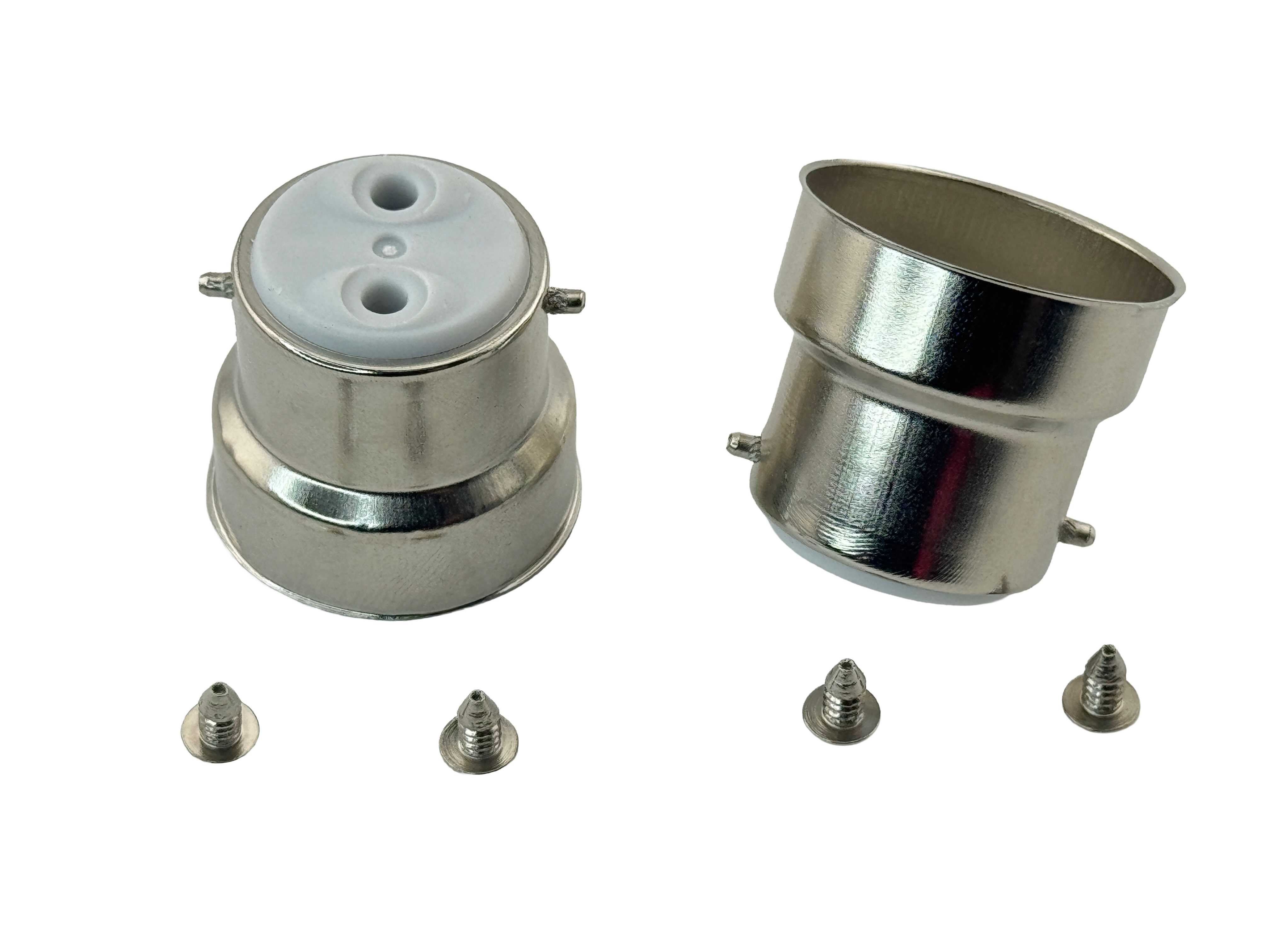 Rebaydo 2 pcs B22 Male Solderless Iron Cap Base Replacement are designed to replace broken, short-circuited, or corroded B22 bulb bases, restoring functionality without replacing the entire bulb or fixture. Made of iron for long life and reliable electrical connection, each unit includes the B22 base and two solderless contacts, allowing wires to be inserted and secured without soldering or special crimping tools. CE, RoHS listed.