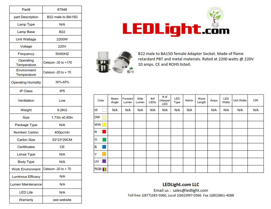B22 male to BA15D female Adapter Socket. Made of flame retardant PBT and metal materials. Rated at 2200 watts @ 220V 10 amps. CE and ROHS listed. Great for vintage or classic automobiles that the BA15D will be a single filament using the two contacts at the bottom of the BA15D. Since the BA15D female socket is plastic only the two contacts from the B22 will connect to the two contacts of the BA15D. The B22 0.866" in diameter. The BA15D socket is 0.59" in diameter.