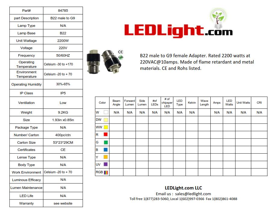 B22 male to G9 female Adapter. Rated 2200 watts at 220VAC@10amps. Made of flame retardant and metal materials. CE and Rohs listed.