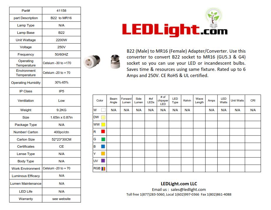 B22 male to MR16 GX4.0 GU5.3 GX5.3 GY6.5 female Adapter/Converter. Use this converter to convert B22 socket to MR16 (GU5.3 & G4) socket so you can use your LED or incandescent bulbs. Saves time & resources using same fixture. Rated up to 6 Amps and 250V. CE RoHS.