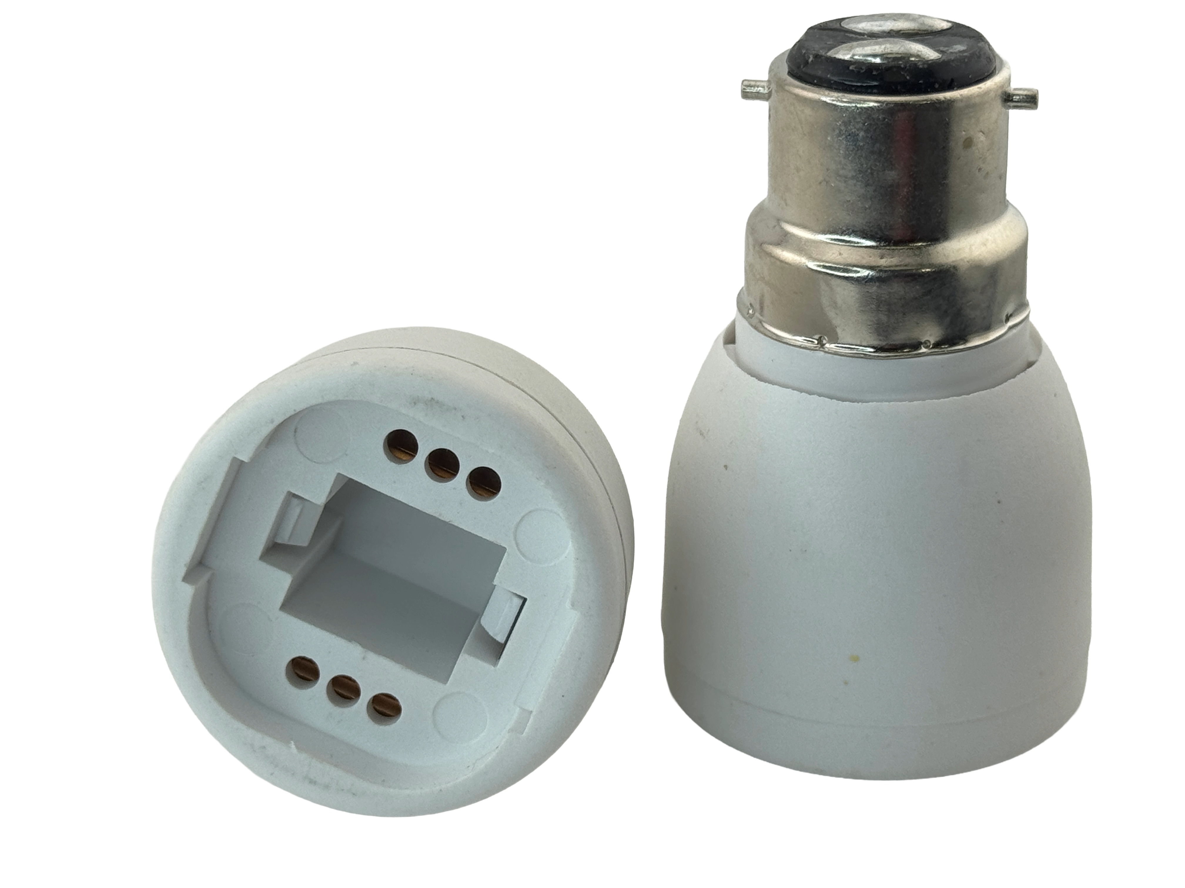 Converts E27 (male) Edison screw base to B22 (female) bayonet base. The rated current is 10 amps. The rated voltage is 220 volts. The rated power is 2200 watts. CE approved.