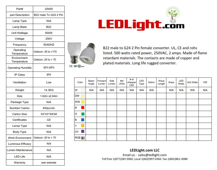 B22 male to G24 2 Pin female converter. UL, CE and rohs listed. 500 watts rated power, 250VAC, 2 amps. Made of flame retardant materials. The contacts are made of copper and plated materials. Long life rugged converter.