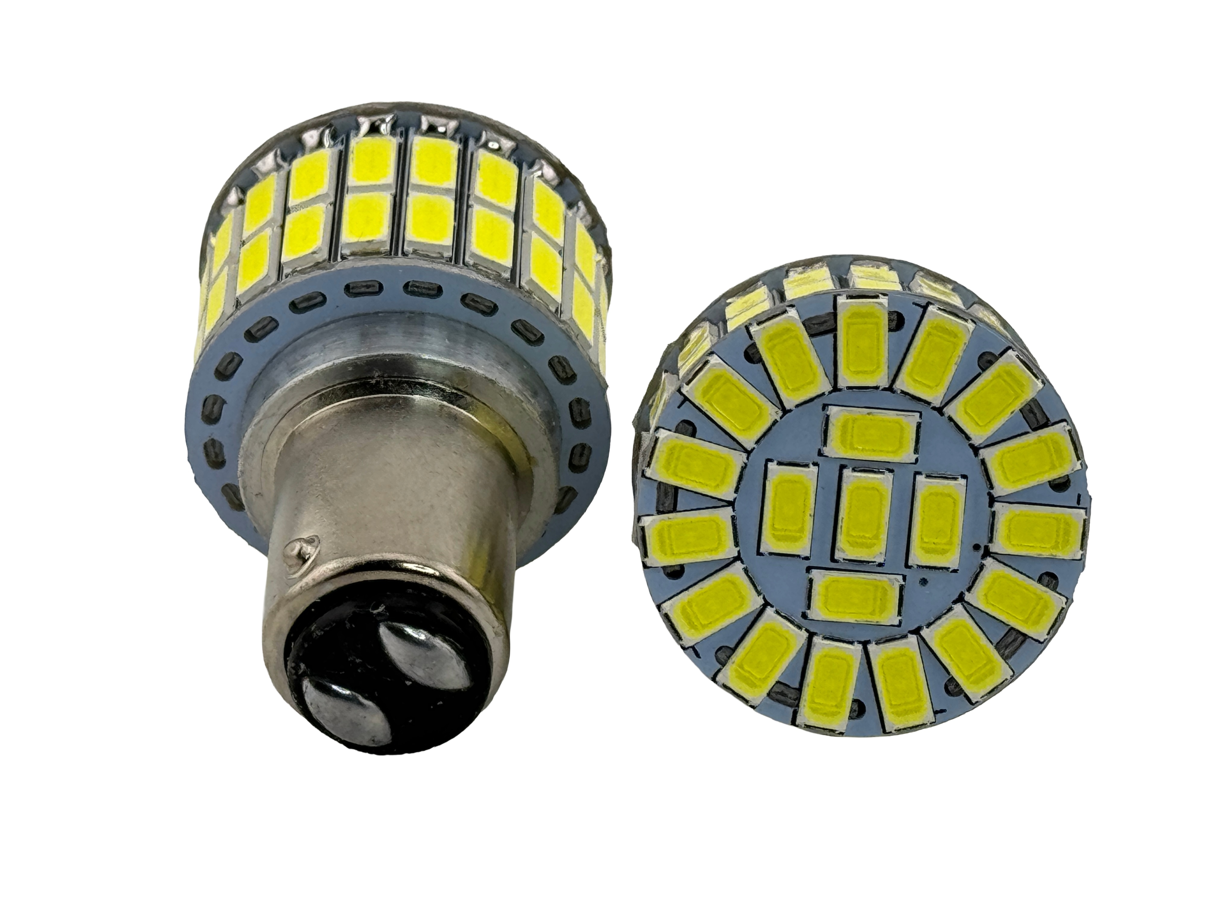 BA15D 1158 12 Volt 60 SMD 5730 Dual Filament Reduced Profile. This bulb is a dual filament 1158. Works either positive ground or negative ground. Up to 900 Lumens for the brake light. Up to 500 Lumens for the taillight. Made with 60 SMD led's, 44 side firing and 16 forward firing, so its super bright. Long life up to 30,000 hours. The base is BA15D for 15mm diameter, even bayonets and two contacts on the bottom. The bulb can be dimmed using variable voltage supply such as your dash board dimmer switch. Available in White 6000K, Warm White 3000K, Red, Yellow/Amber, Green and Blue. If the color attribute is not shown it means that we are out of stock of that color and usually takes 4 to 8 weeks to restock that color. Maximum overall length is 1.694". The maximum overall diameter is 1.058". The White 6000K color at 12.09 volts uses approximately 0.97mA for the low beam. The Warm White 3000K color at 12.09 volts uses approximately 0.096 amps for the low beam. The Yellow/Amber color at 12.09 volts uses about 0.096 amps for the low beam. The Red color at 12.09 volts uses approximately 0.104 amps for the low beam. The Green color at 12.09 volts uses approximately 0.104 amps for the low beam. The Blue color at 12.09 volts uses approximately 0.094 amps for the low beam. The White 6000K color uses about 0.481 amps for the high beam. The Warm White color at 12.09 volts uses approximately 0.497 amps for the high beam. The Yellow/Amber color at 12.09 volts uses approximately 0.492 for the high beam. The Red color at 12.09 volts uses approximately 0.500 amps for the high beam. The Green color at 12.09 volts uses approximately 0.534 amps for the high beam. The Blue color at 12.09 volts uses approximately 0.481 amps for the high beam. The White 6000K color starts to illuminate approximately 6.15 volts for either the low beam or the high beam. The Warm White 3000K color starts to illuminate approximately 6.15 volts for either the low beam or the high beam. The Yellow/Amber color starts to illuminate approximately 6.15 volts for either the low beam or the high beam. The Red color starts to illuminate approximately 5.30 volts for either the low beam or the high beam. The Green color starts to illuminate approximately 5.66 volts for either the low beam or the high beam. The Blue color starts to illuminate approximately 6.45 volts for either the low beam or the high beam. Each bulb filaments is tested before shipping. Comes 1 per package. Load equalizers may be required since led lights do not draw as much wattage as a incandescent bulb. CE and Rohs.