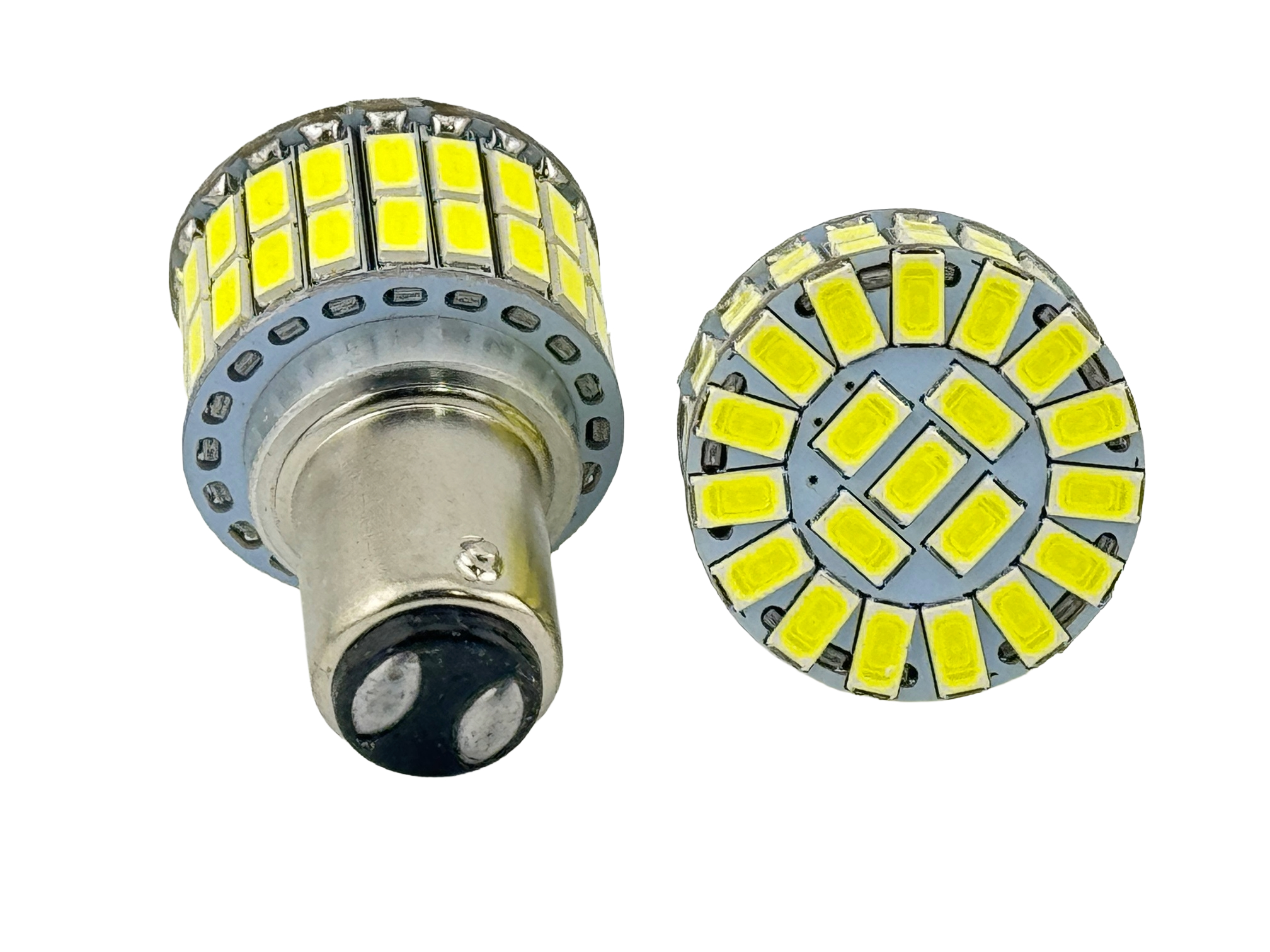 BA15D 6 Volt 60 SMD 5730 Single Filament Reduced Profile. This bulb operates 6v positive ground or 6V negative ground. Up to 900 Lumen output. Up to 340 forward firing Lumens and 560 side firing Lumens. Long life up to 30,000 hours. Made with total 60 leds, 44 side firing and 16 forward firing. This lamp is a single filament bulb. The base has even bayonets and two contacts on the bottom. This bulb is only designed for 6 volt vintage vehicles, motorcycles and scooters. Please make sure you voltage is regulated to 6 volts. The light bulb can be dimmed with a variable voltage supply if needed. The leds are aligned to be the optimum height for maximum light output using a reflector and lens. Available in White 6000K, Warm White 3000K, Red and Yellow. Maximum overall length is 1.694". The maximum diameter is 1.058". These lights led are solid state for low power and super long life. SMD means surface mount device it is the square led. Uses about 600mA @ 6.3 Volts. CE and Rohs.