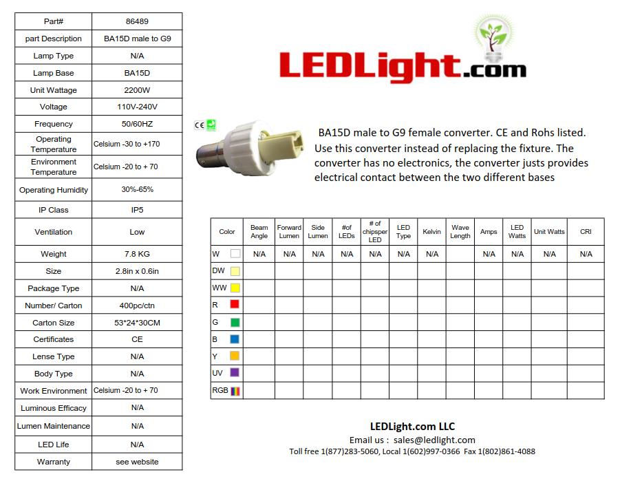 BA15D male to G9 female converter. CE and Rohs listed. Use this converter instead of replacing the fixture. The converter has no electronics, the converter justs provides electrical contact between the two different bases.