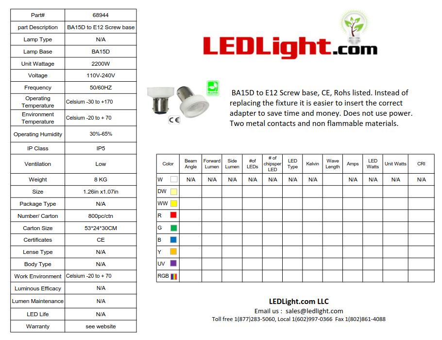 BA15D to E12 Screw base, CE, Rohs listed. Instead of replacing the fixture it is easier to insert the correct adapter to save time and money. Does not use power. Two metal contacts and non flammable materials.