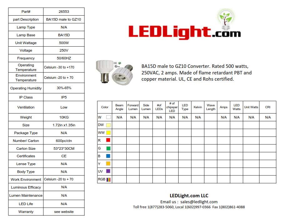 BA15D male to GZ10 Converter. Rated 500 watts, 250VAC, 2 amps. Made of flame retardant PBT and copper material. UL, CE and Rohs certified.