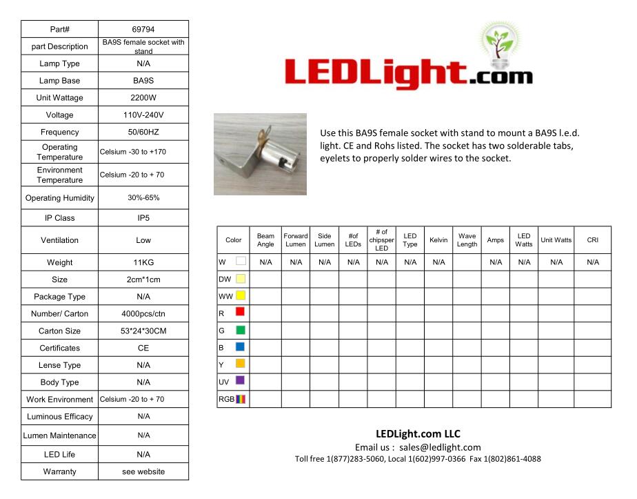 Use this BA9S female socket with stand to mount a BA9S l.e.d. light. CE and Rohs listed. The socket has two solderable tabs, eyelets to properly solder wires to the socket.
