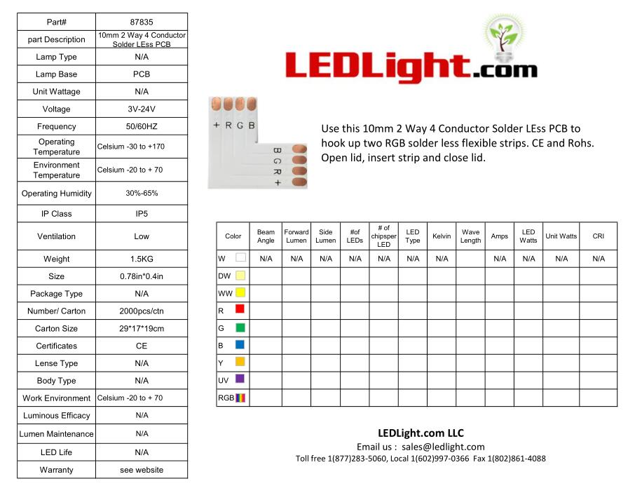 Use this 10mm 2 Way 4 Conductor Solder LEss PCB to hook up two RGB solder less flexible strips. CE and Rohs. Open lid, insert strip and close lid.