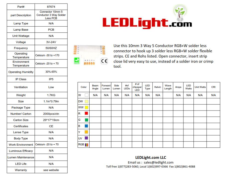 Use this 10mm 3 Way 5 Conductor RGB+W solder less connector to hook up 3 solder less RGB+W solder flexible strips. CE and Rohs listed. Open connector, insert strip close lid very easy to use, instead of a solder iron or crimp tool.