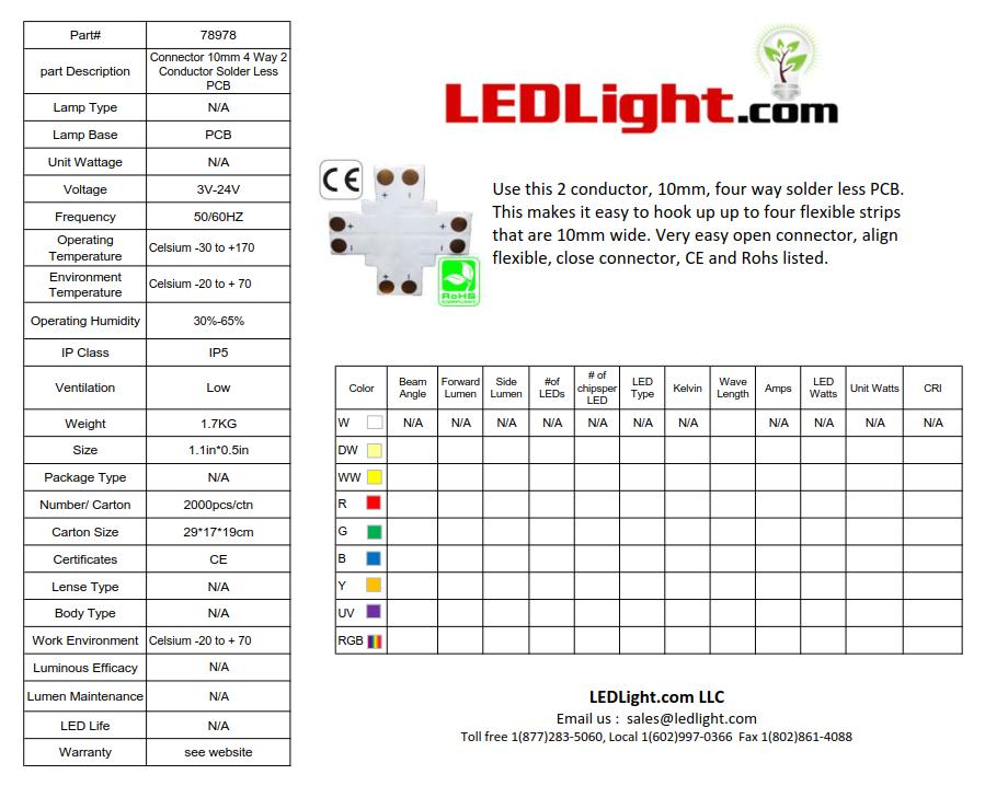 Use this 2 conductor, 10mm, four way solder less PCB. This makes it easy to hook up up to four flexible strips that are 10mm wide. Very easy open connector, align flexible, close connector, CE and Rohs listed.