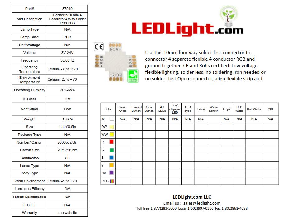 Connector, 10mm, RGB Color, No Wires. Use this quick connector to hook up and interlink RGB flexible 10mm LED strip. Made of PBT and metal materials. CE and Rohs listed.