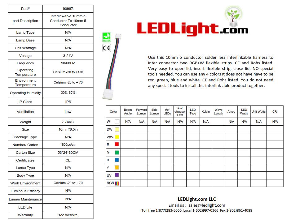 Use this 10mm 5 conductor solder less interlinkable harness to inter connector two RGB+W flexible strips. CE and Rohs listed. Very easy to open lid, insert flexible strip, close lid. NO special tools needed. You can use any 4 colors it does not have have to be red, green, blue and white. CE and Rohs listed. You do not need any special tools to install this interlink-able product together.