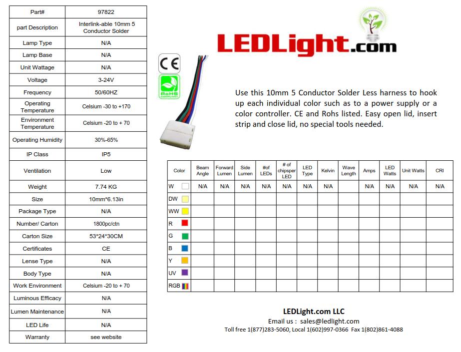 Use this 10mm 5 Conductor Solder Less harness to hook up each individual color such as to a power supply or a color controller. CE and Rohs listed. Easy open lid, insert strip and close lid, no special tools needed.