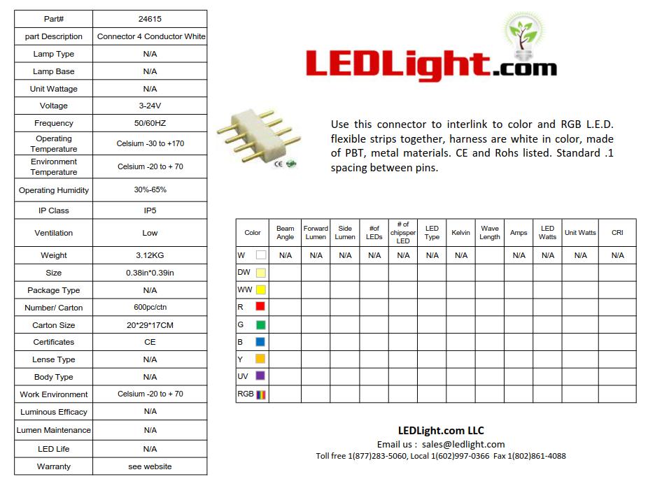 Use this connector to interlink to color and RGB L.E.D. flexible strips together, harness are white in color, made of PBT, metal materials. CE and Rohs listed. Standard .1 spacing between pins.