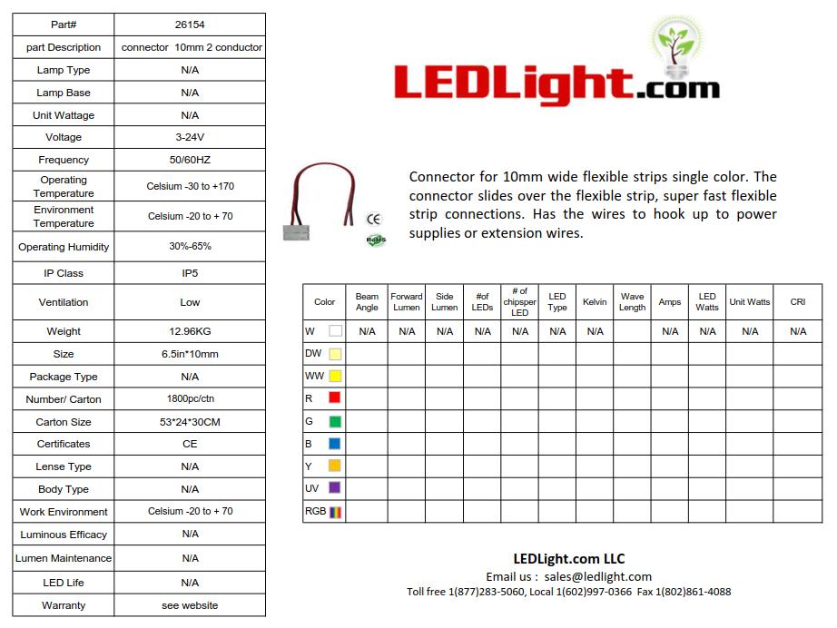 Use this connector to interlink to flexible 8mm strips together. Wires about 3.5" long. Made of pbt plastic and metal materials. CE and Rohs listed.