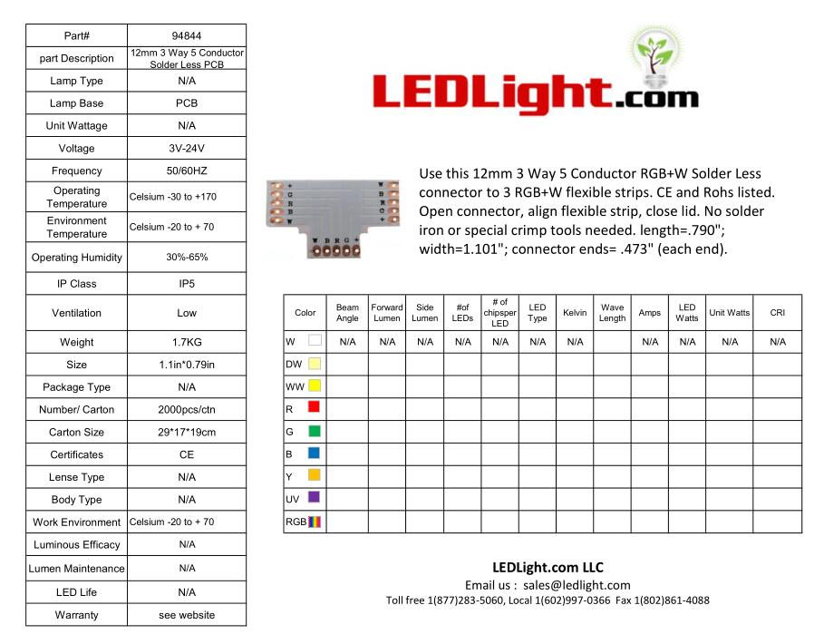 Use this 12mm 3 Way 5 Conductor RGB+W Solder Less connector to 3 RGB+W flexible strips. CE and Rohs listed. Open connector, align flexible strip, close lid. No solder iron or special crimp tools needed. length=.790"; width=1.101"; connector ends= .473" (each end).