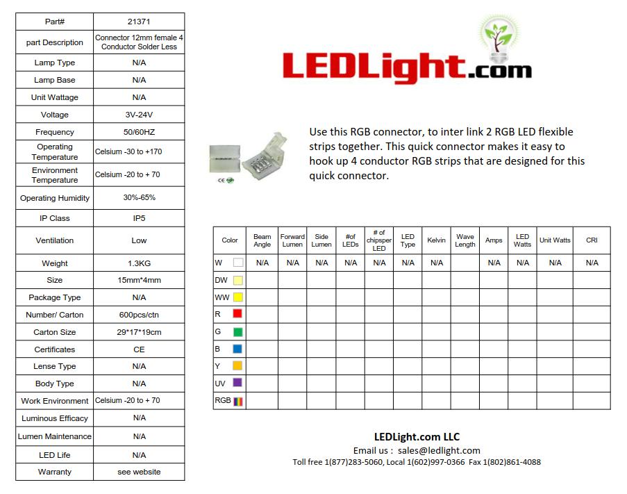 Use this RGB connector, to inter link 2 RGB LED flexible strips together. This quick connector makes it easy to hook up 4 conductor RGB strips that are designed for this quick connector.