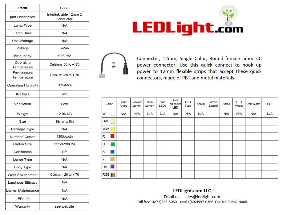 Connector, 12mm, Single Color with wires. Use this harness to quick connect for flexible led strips. Made of PBT and metal materials. CE and Rohs listed. |
