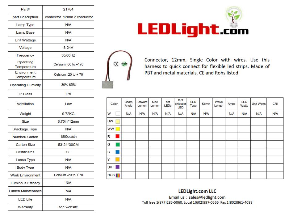 Connector 12mm Single Color 2 Conductor with wires. Use this harness to quick connect for flexible led strips. Made of PBT and metal materials. CE and Rohs listed. No special tools are required to hook up this 12mm 2 conductor with wires