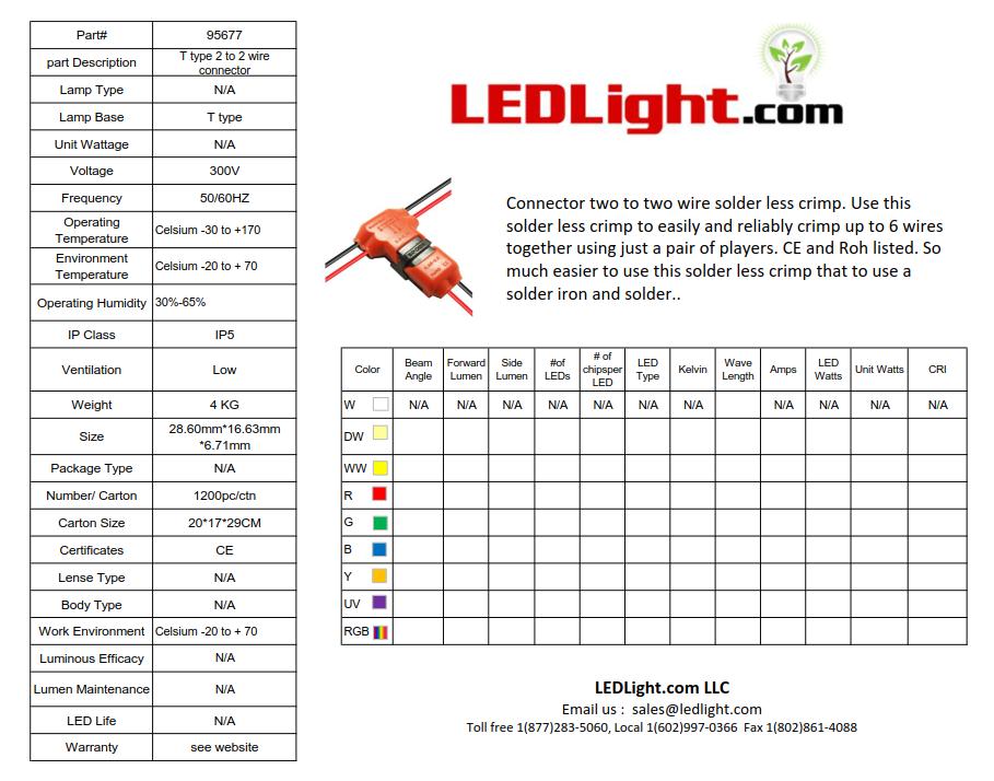 Connector two to two wire solder less crimp. Use this solder less crimp to easily and reliably crimp up to 6 wires together using just a pair of players. CE and Roh listed. So much easier to use this solder less crimp that to use a solder iron and solder.