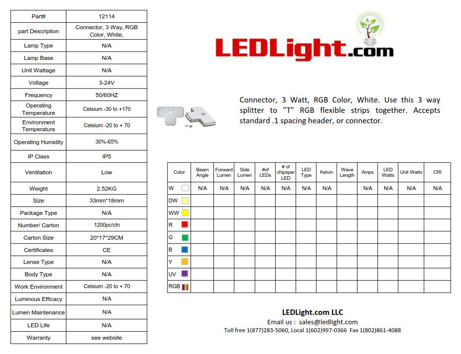Connector, 3 Watt, RGB Color, White. Use this 3 way splitter to "T" RGB flexible strips together. Accepts standard .1 spacing header, or connector.