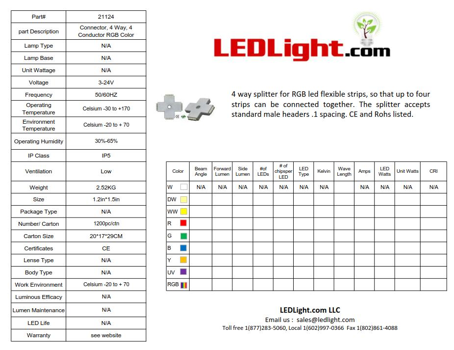 4 way splitter for RGB led flexible strips, so that up to four strips can be connected together. The splitter accepts standard male headers .1 spacing. CE and Rohs listed.