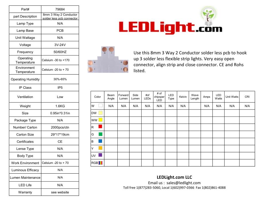 Use this 8mm 3 Way 2 Conductor solder less pcb to hook up 3 solder less flexible strip lights. Very easy open connector, align strip and close connector. CE and Rohs listed.