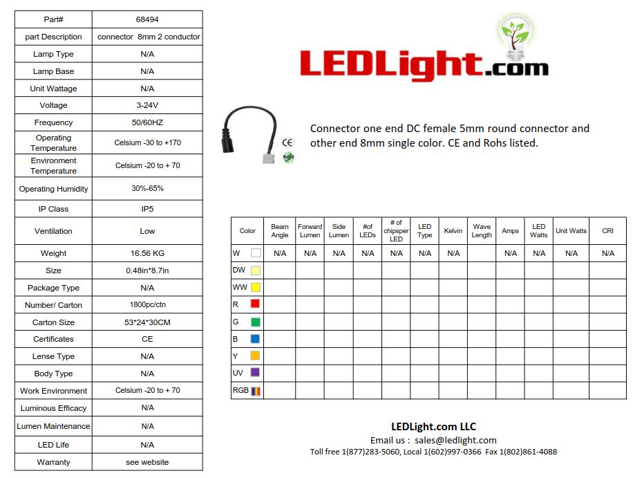 Use this connector to interlink to flexible 8mm strips together. Wires about 3.5" long. Made of pbt plastic and metal materials. CE and Rohs listed.