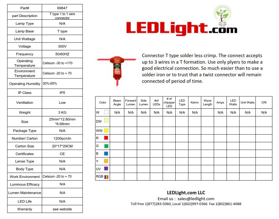 Connector T type solder less crimp. The connect accepts up to 3 wires in a T formation. Use only plyers to make a good electrical connection. So much easier than to use a solder iron or to trust that a twist connector will remain connected of period of time.