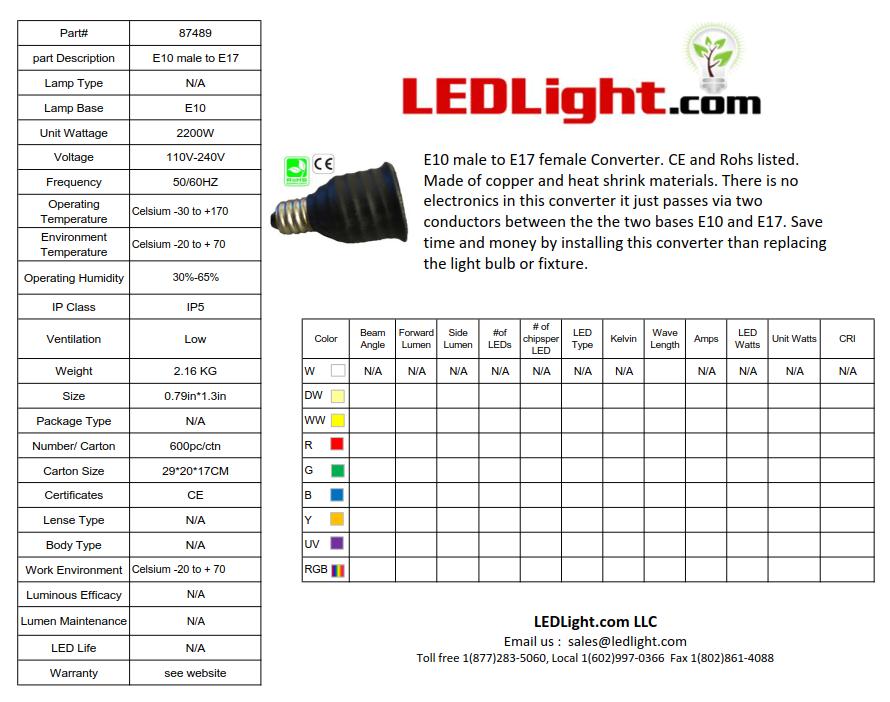 E10 male to E17 female Converter. CE and Rohs listed. Made of copper and heat shrink materials. There is no electronics in this converter it just passes via two conductors between the the two bases E10 and E17. Save time and money by installing this converter than replacing the light bulb or fixture.