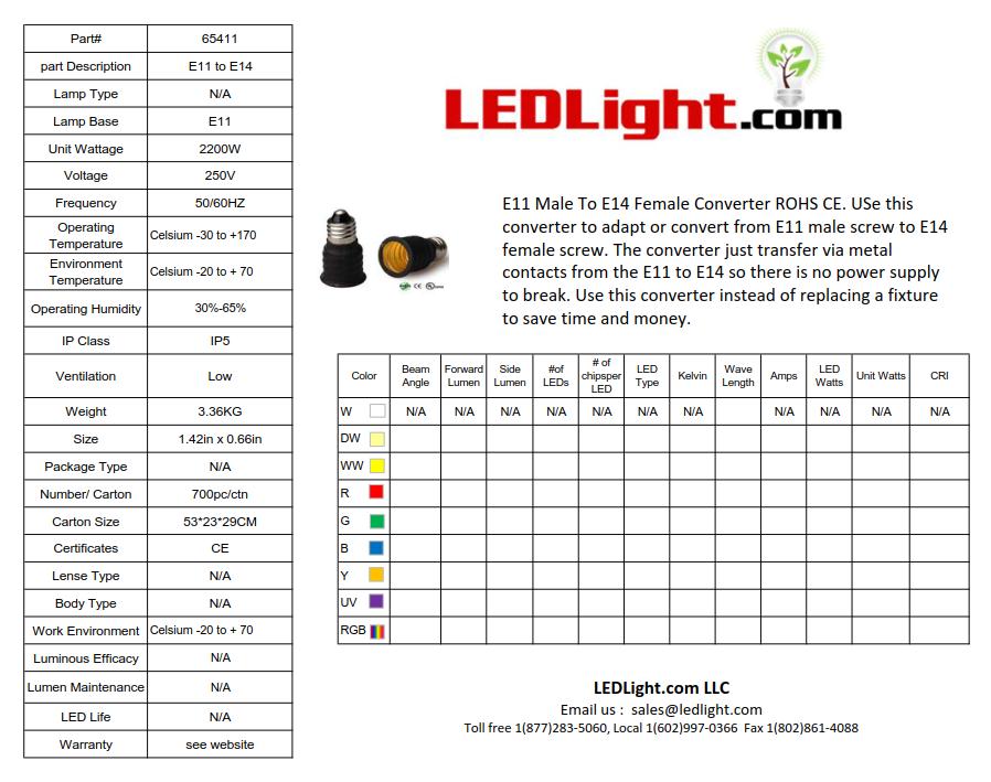 E11 Male To E14 Female Converter ROHS CE. USe this converter to adapt or convert from E11 male screw to E14 female screw. The converter just transfer via metal contacts from the E11 to E14 so there is no power supply to break. Use this converter instead of replacing a fixture to save time and money.