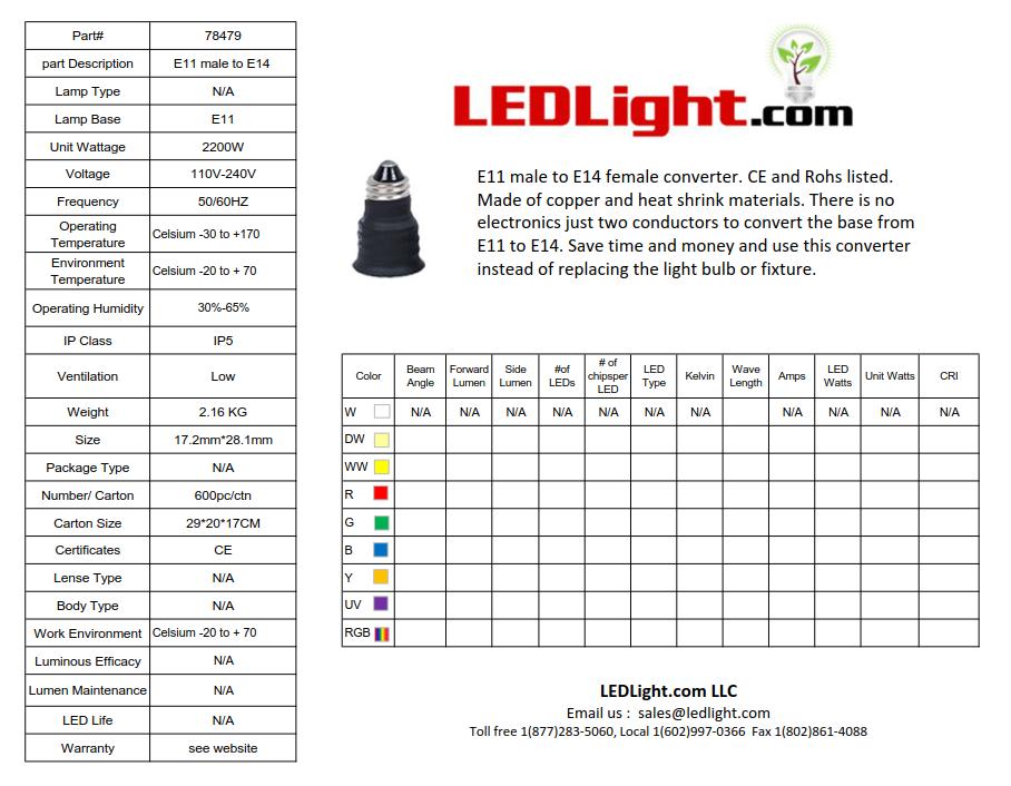 E11 Screw base male To E17 Screw base female con. Rated 250VAC@2 amps. UL, CE and ROHS listed. Made of flame retardant PBT and copper materials.