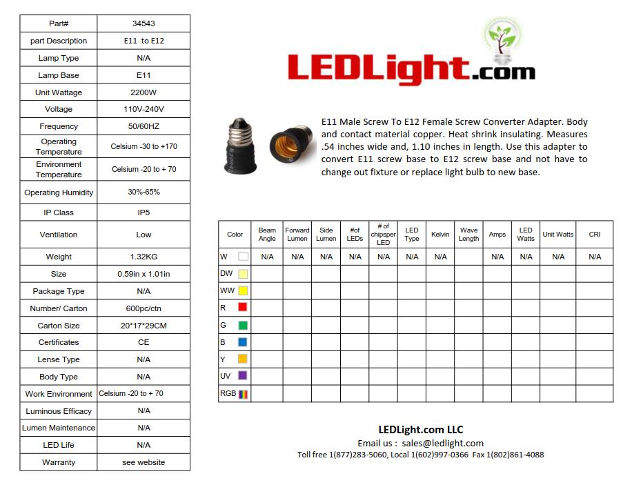E11 Male Screw To E12 Female Screw Converter Adapter. Body and contact material copper. Heat shrink insulating. Measures .54 inches wide and, 1.10 inches in length. Use this adapter to convert E11 screw base to E12 screw base and not have to change out fixture or replace light bulb to new base.