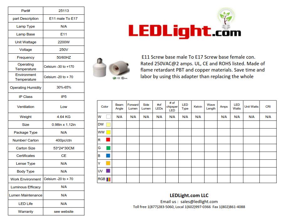 E11 Screw base male To E17 Screw base female con. Rated 250VAC@2 amps. UL, CE and ROHS listed. Made of flame retardant PBT and copper materials. Save time and labor by using this adapter than replacing the whole fixture. No special tools needed.