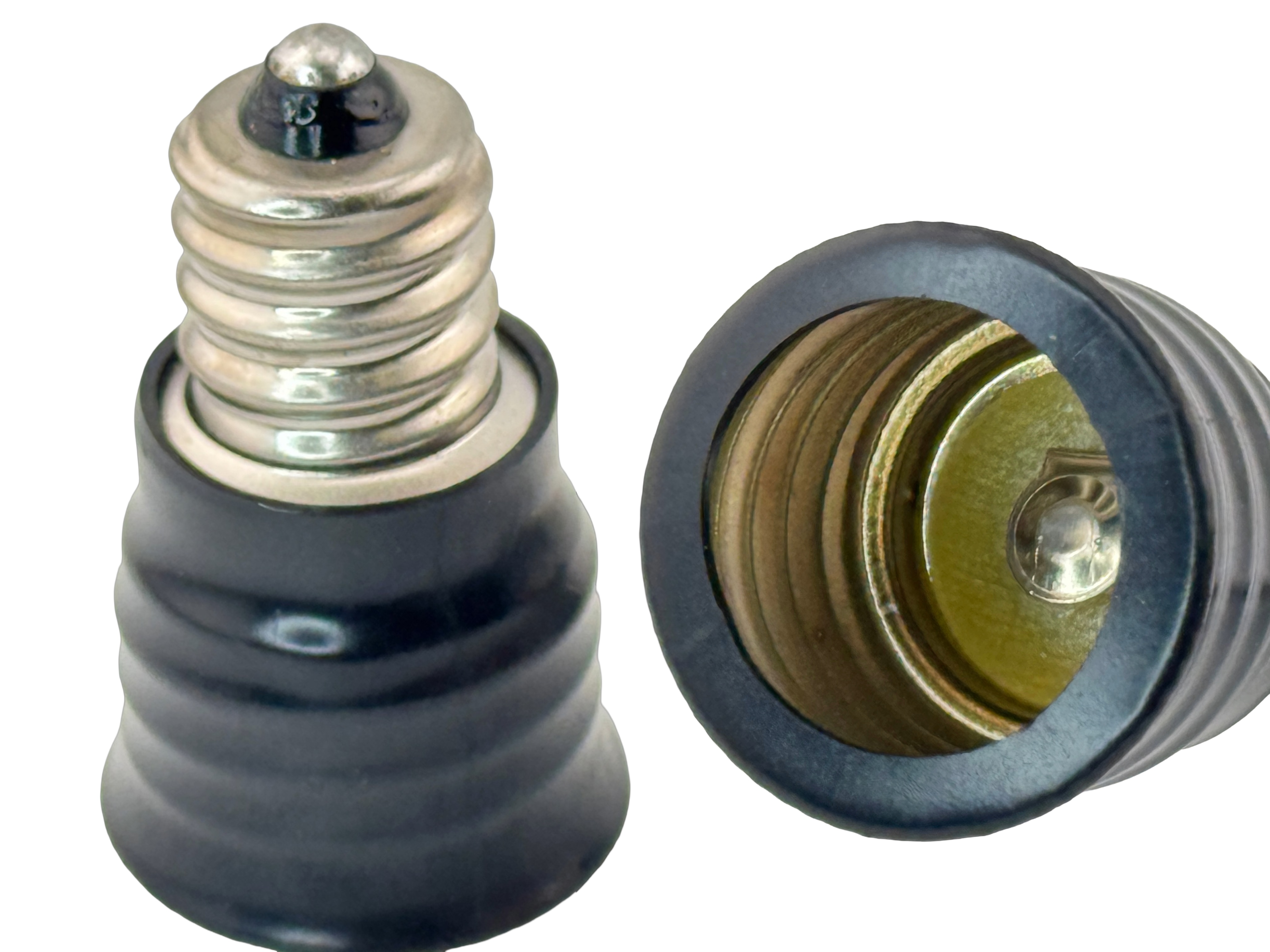 Rebaydo 2pcs E12 (male) Screw To E17 (female) Screw Converter Adapter. Body and contact material copper. Heat shrink insulating. Use this adapter to convert E12 screw base to E17 screw base and not have to change out fixture or replace light bulb to new base. Rated up to 6 Amps and 250V. CE RoHS & UL certified.