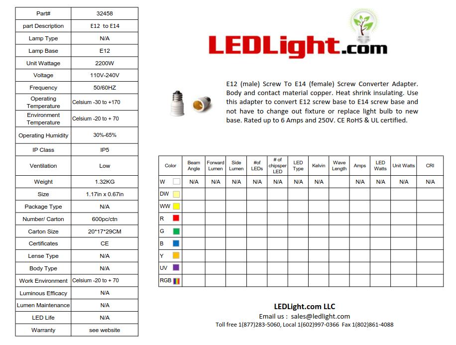 E14 (male) to E12 (female) Adapter/Converter. Use this converter to convert E14 socket to E12 socket so you can use your LED or incandescent bulbs. Saves time & resources using same fixture.