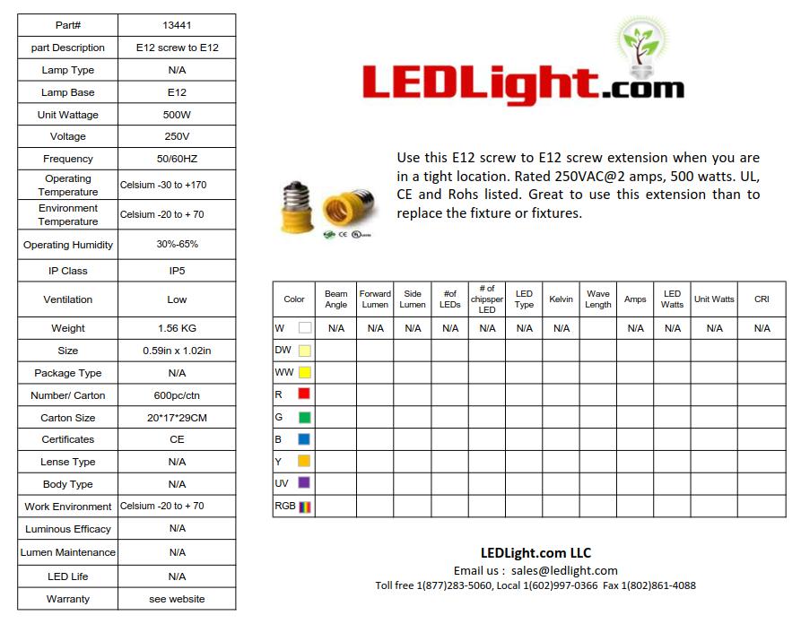 Use this E12 screw to E12 screw extension when you are in a tight location. Rated 250VAC@2 amps, 500 watts. CE and Rohs listed. Great to use this extension than to replace the fixture or fixtures. No special tools needed. As reliable as using the default bulb for the fixture.