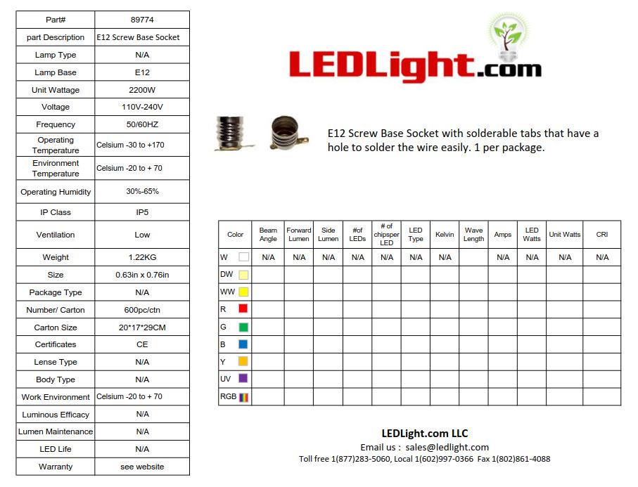 E12 Screw Base Socket with solderable tabs that have a hole to solder the wire easily. 1 per package.
