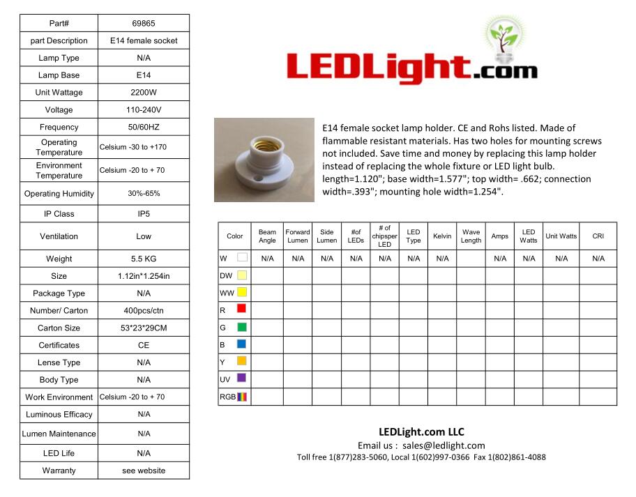 E14 female socket lamp holder. CE and Rohs listed. Made of flammable resistant materials. Has two holes for mounting screws not included. Save time and money by replacing this lamp holder instead of replacing the whole fixture or LED light bulb. length=1.120"; base width=1.577"; top width= .662; connection width=.393"; mounting hole width=1.254". Compatible with: European E14