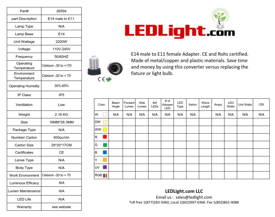 E14 male to E11 female Adapter. CE and Rohs certified. Made of metal/copper and plastic materials. Save time and money by using this converter versus replacing the fixture or light bulb. Up to 2200 Watts. Up to 240 VAC. Up to 10 Amps@220 VAC.