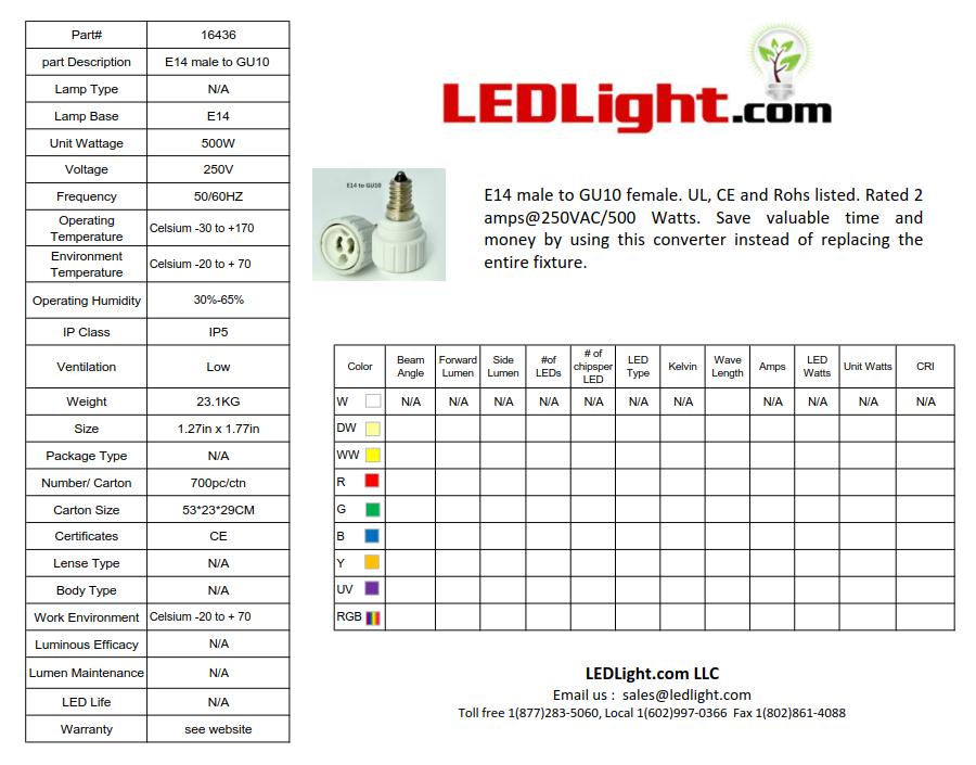 E14 male to GU10 female. CE and Rohs listed. Rated 2 amps@250VAC/500 Watts. Save valuable time and money by using this converter instead of replacing the entire fixture.