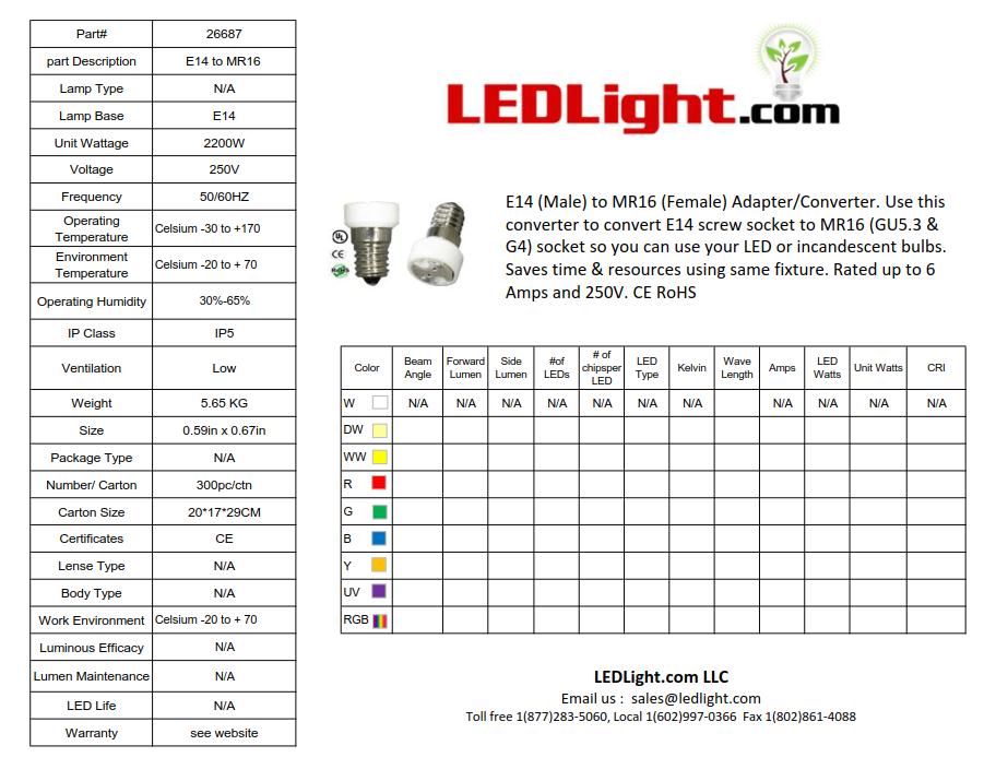 E14 (Male) to MR16 (Female) Adapter/Converter. Use this converter to convert E14 screw socket to MR16 (GU5.3 & G4) socket so you can use your LED or incandescent bulbs. Saves time & resources using same fixture. Rated up to 6 Amps and 250V. CE RoHS