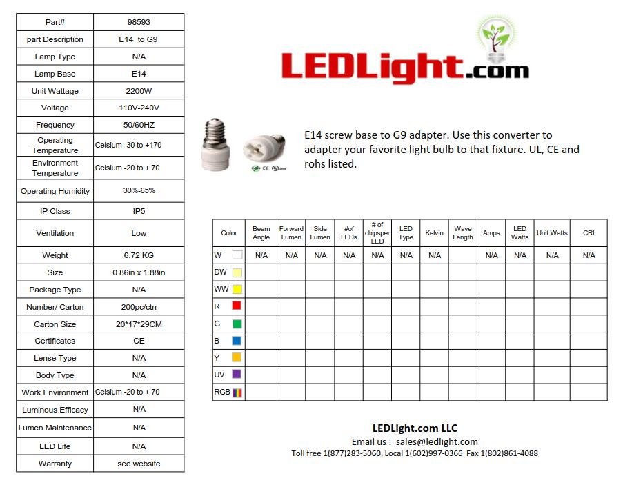 E14 screw base to G9 adapter. Use this converter to adapter your favorite light bulb to that fixture. CE and Rohs listed. Save time and money by using this converter instead of replacing the light bulb or the fixture.